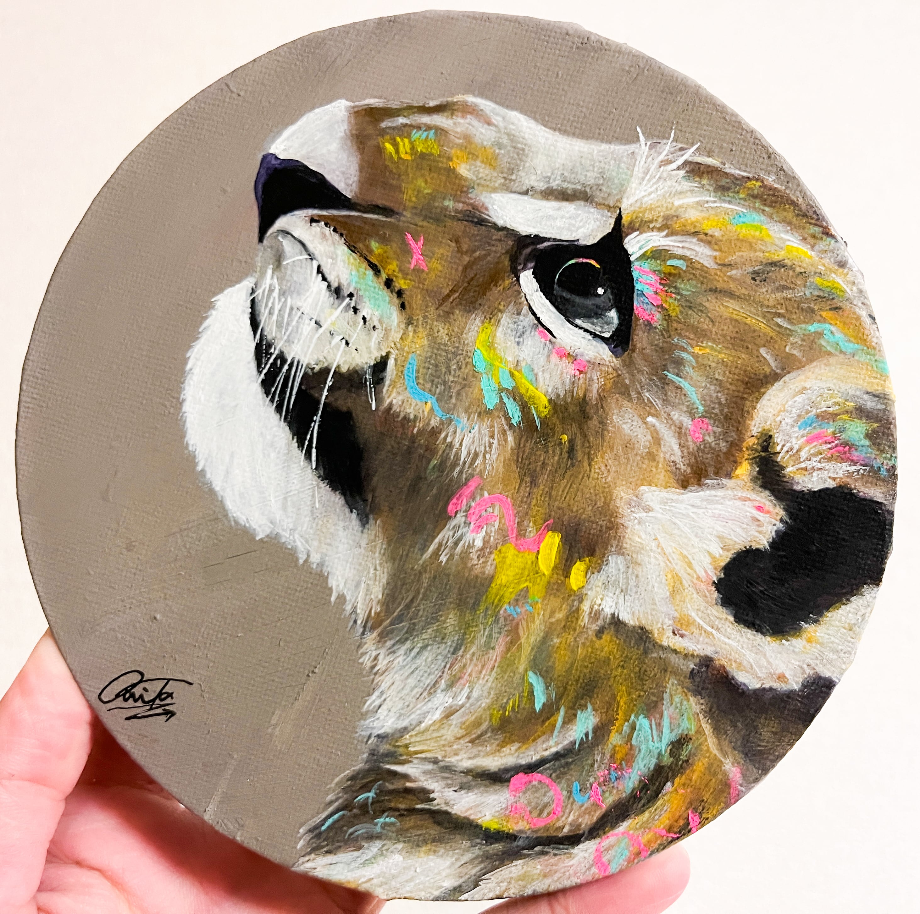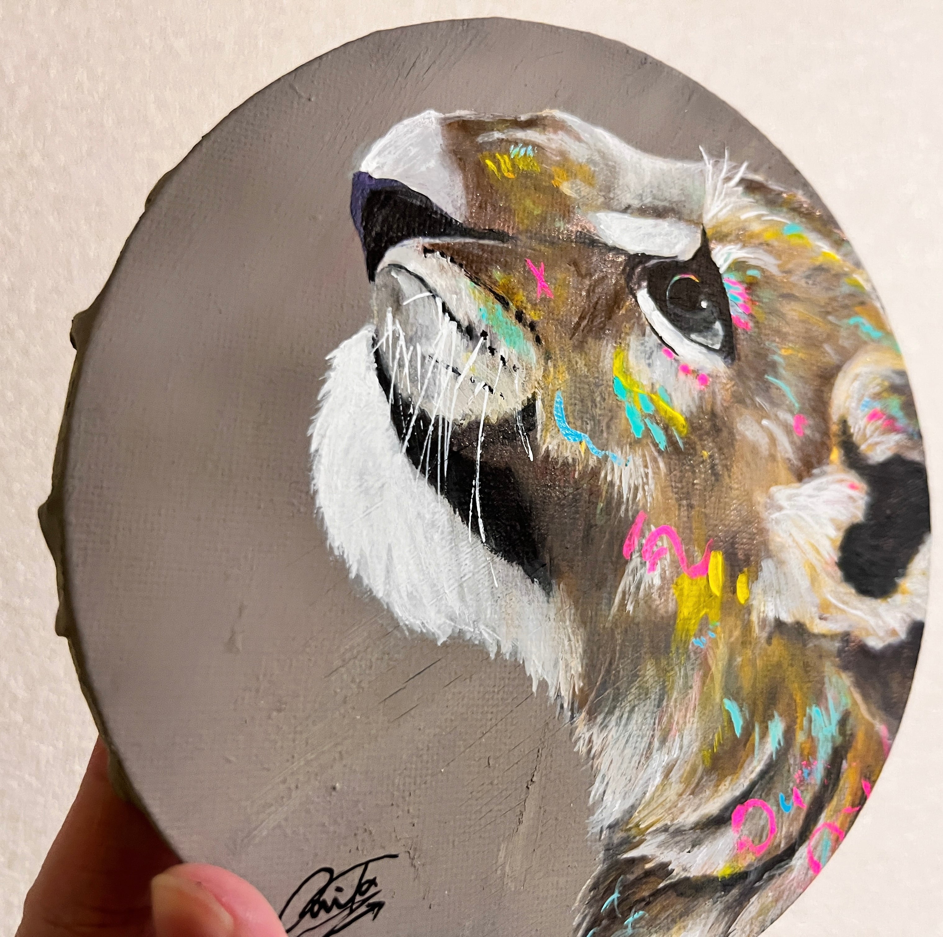 複数回の重ね塗りにより、独特の盛り上がりがあるため、平面のキャンバスでありながら立体感がある作品となっています