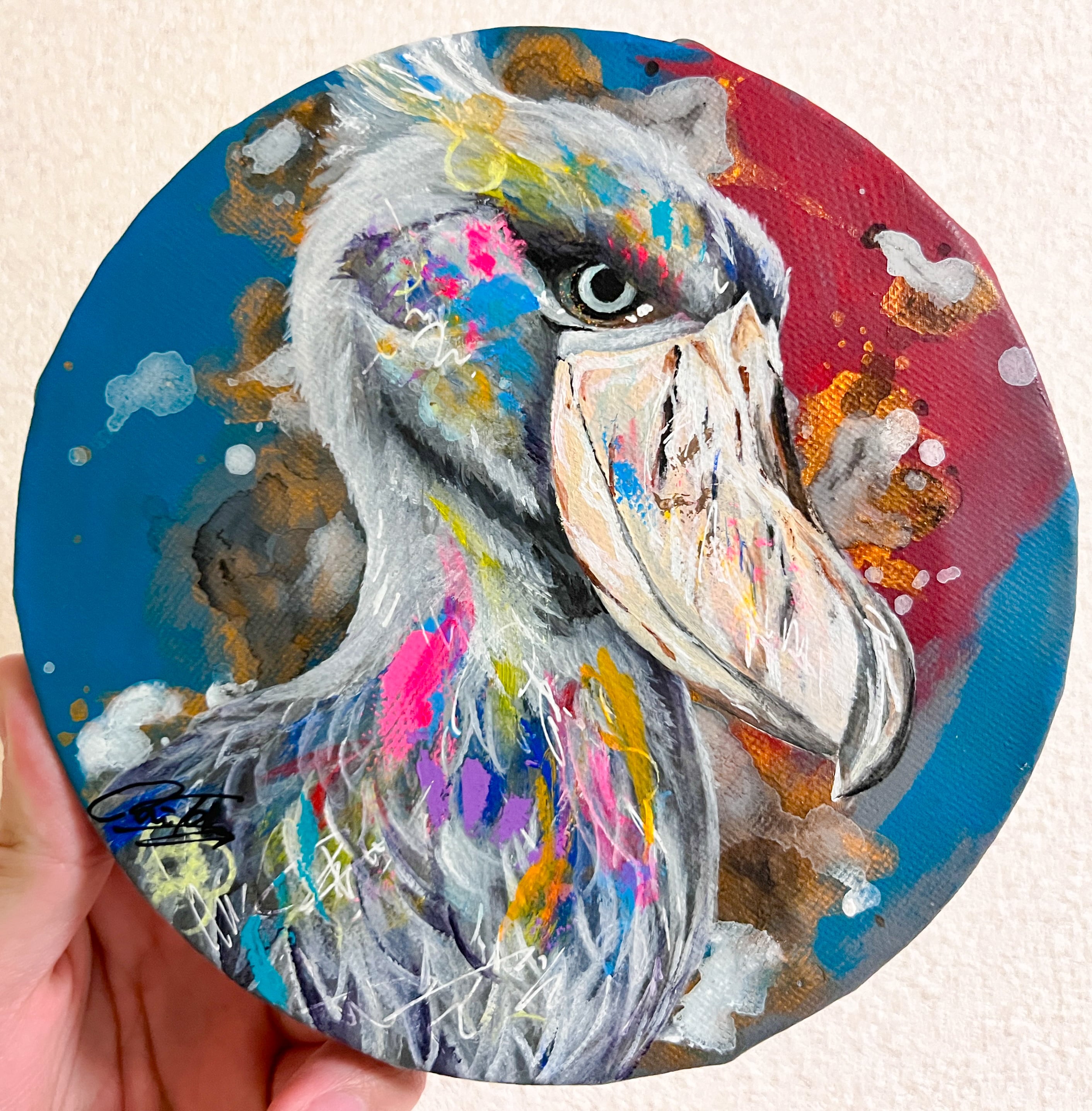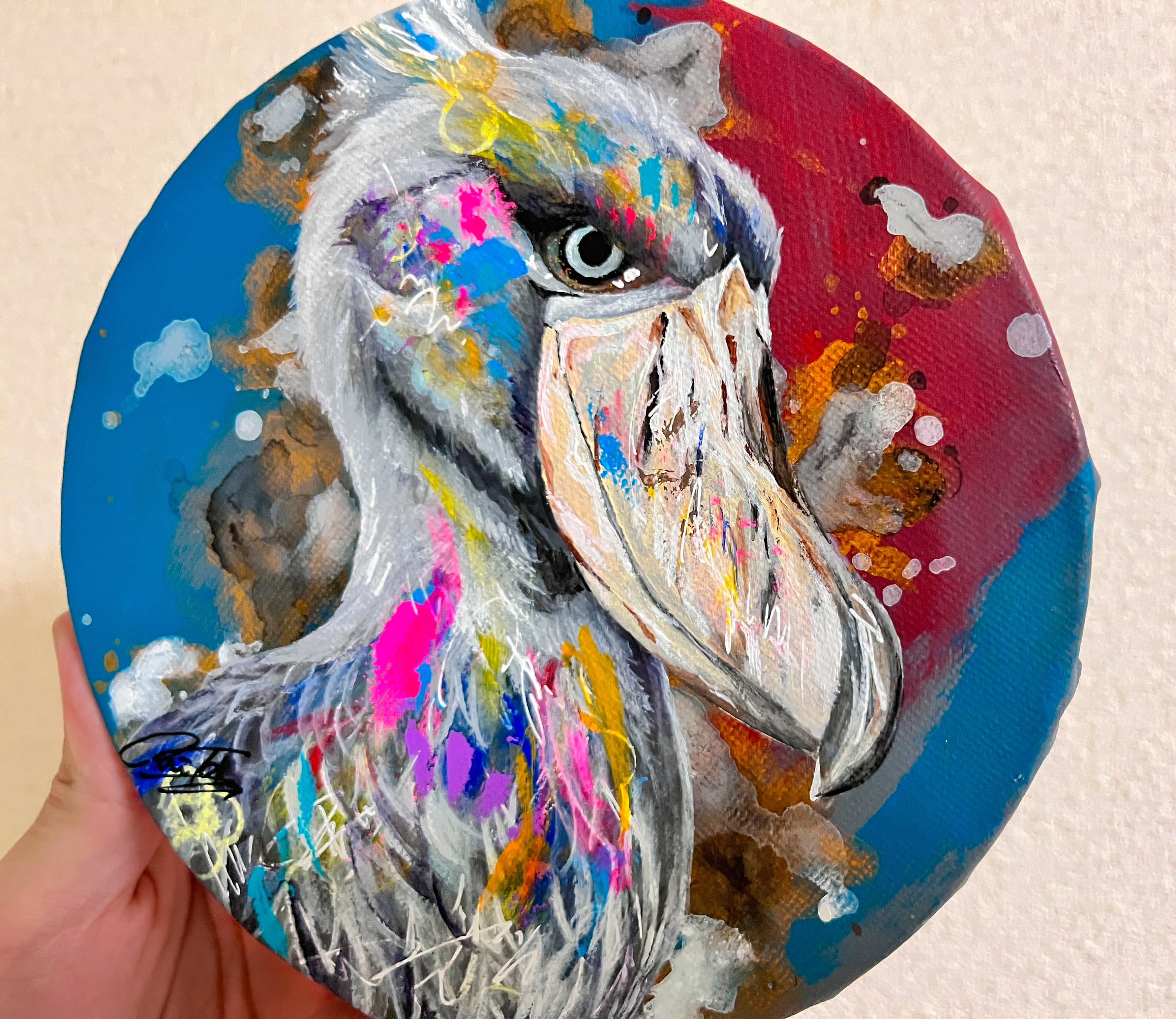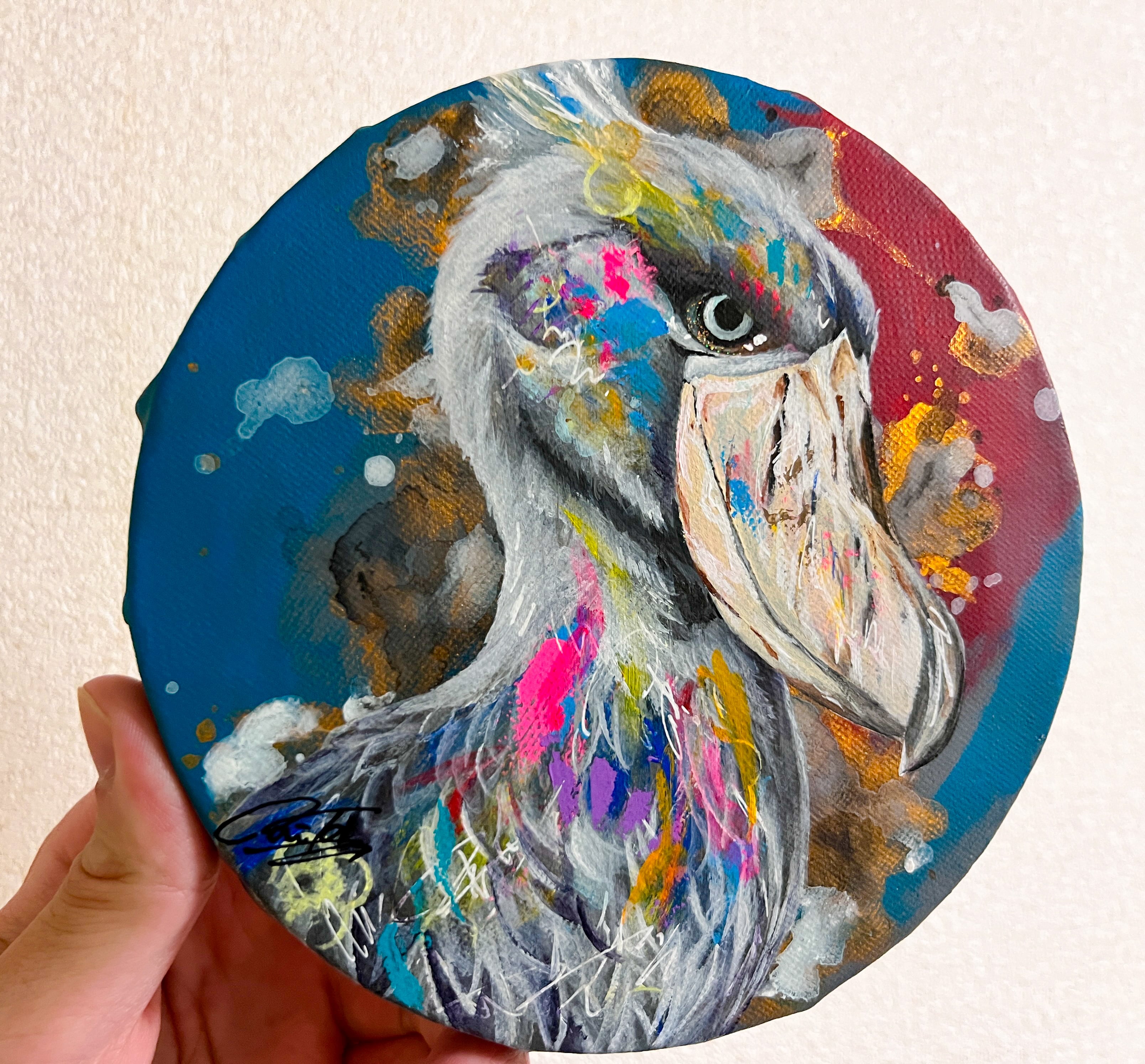 普段は静かでありながも飛ぶ時は大胆なハシビロコウをイメージし、大人っぽさのある背景にしつつ派手な作品に仕上げました