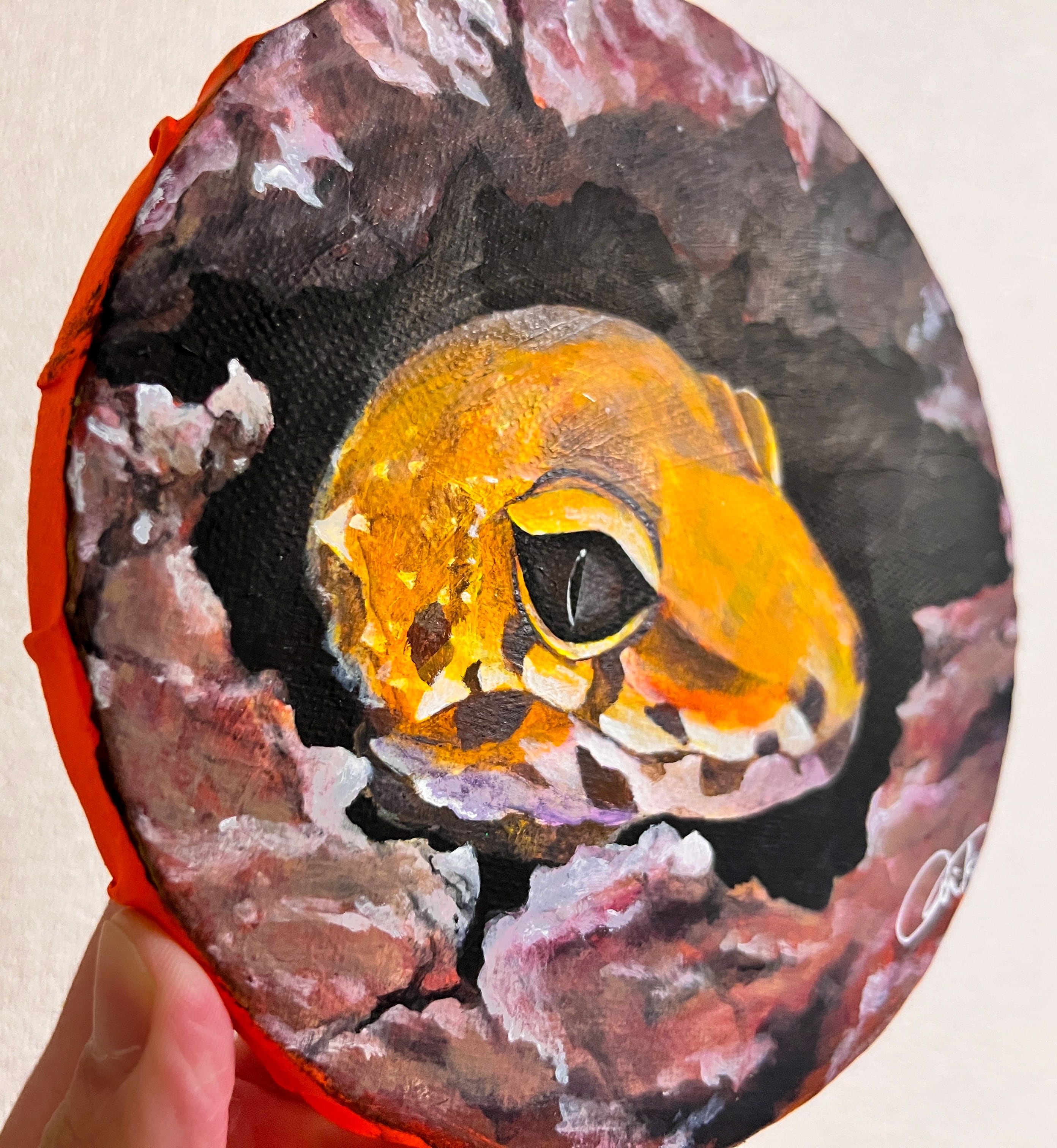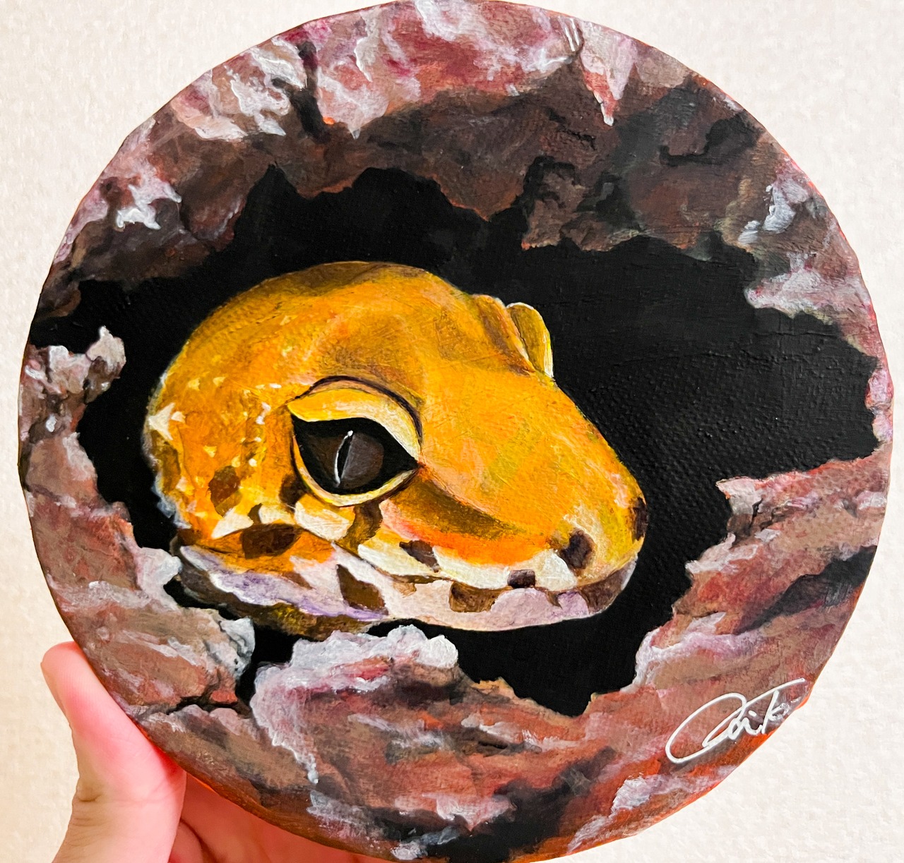 岩場に隠れるレオパをアクリル絵の具でかきました